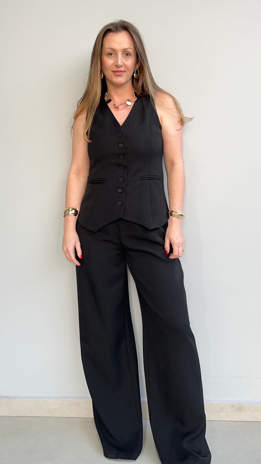 Conjunto em alfaiataria Dubai leve com toque macio e excelente caimento. O colete tem modelagem acinturada, decote V, recortes estratégicos e fechamento frontal por botões forrados. A calça pantalona conta com cintura alta, cós reto e fechamento invisível, além de bolsos laterais que trazem funcionalidade. A silhueta alongada garantem um visual elegante e feminino. Ideal para composições modernas e versáteis.